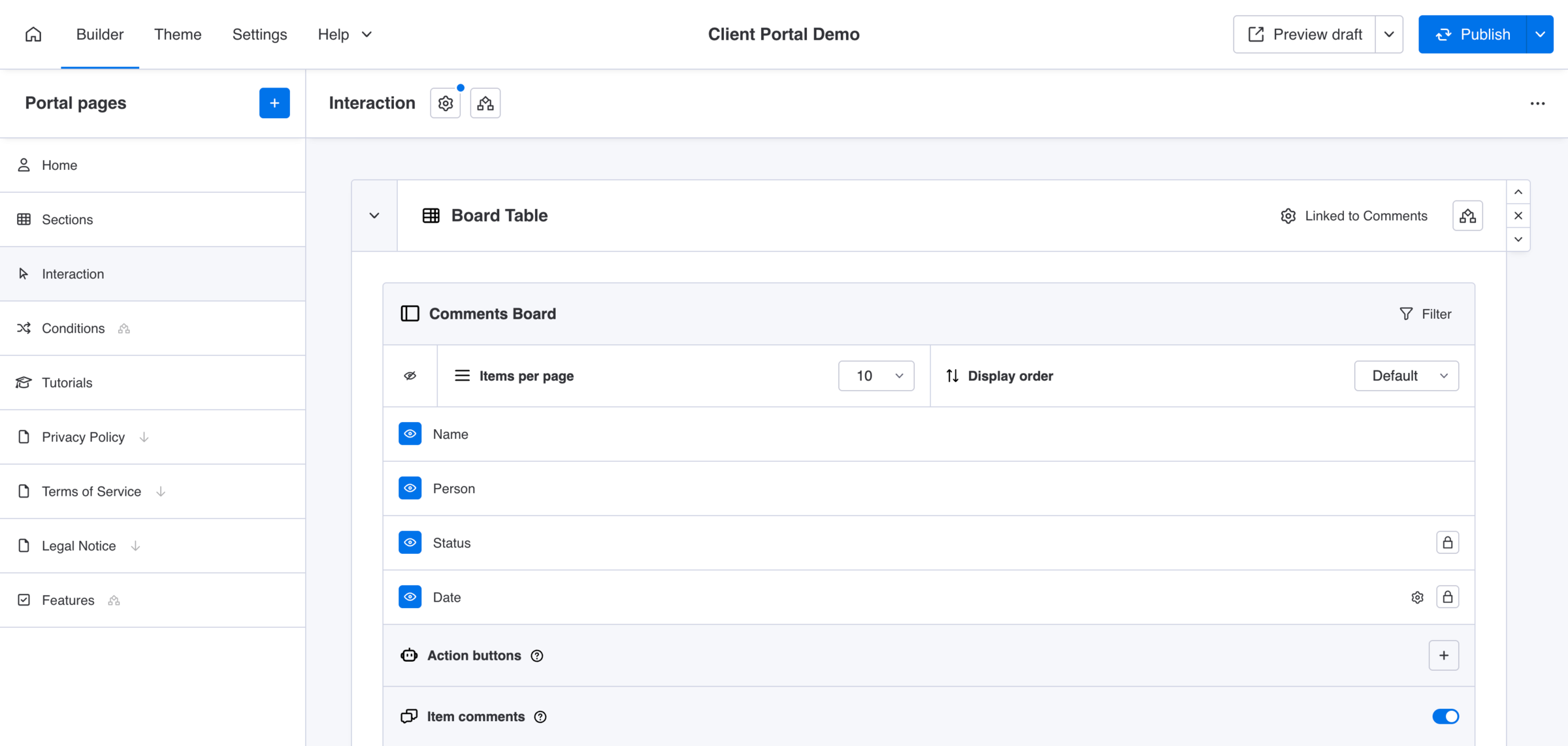 The monday.com workspace is designed for internal collaboration. You can invite clients as guests or share boards, but these features are not built to create a structured client experience.